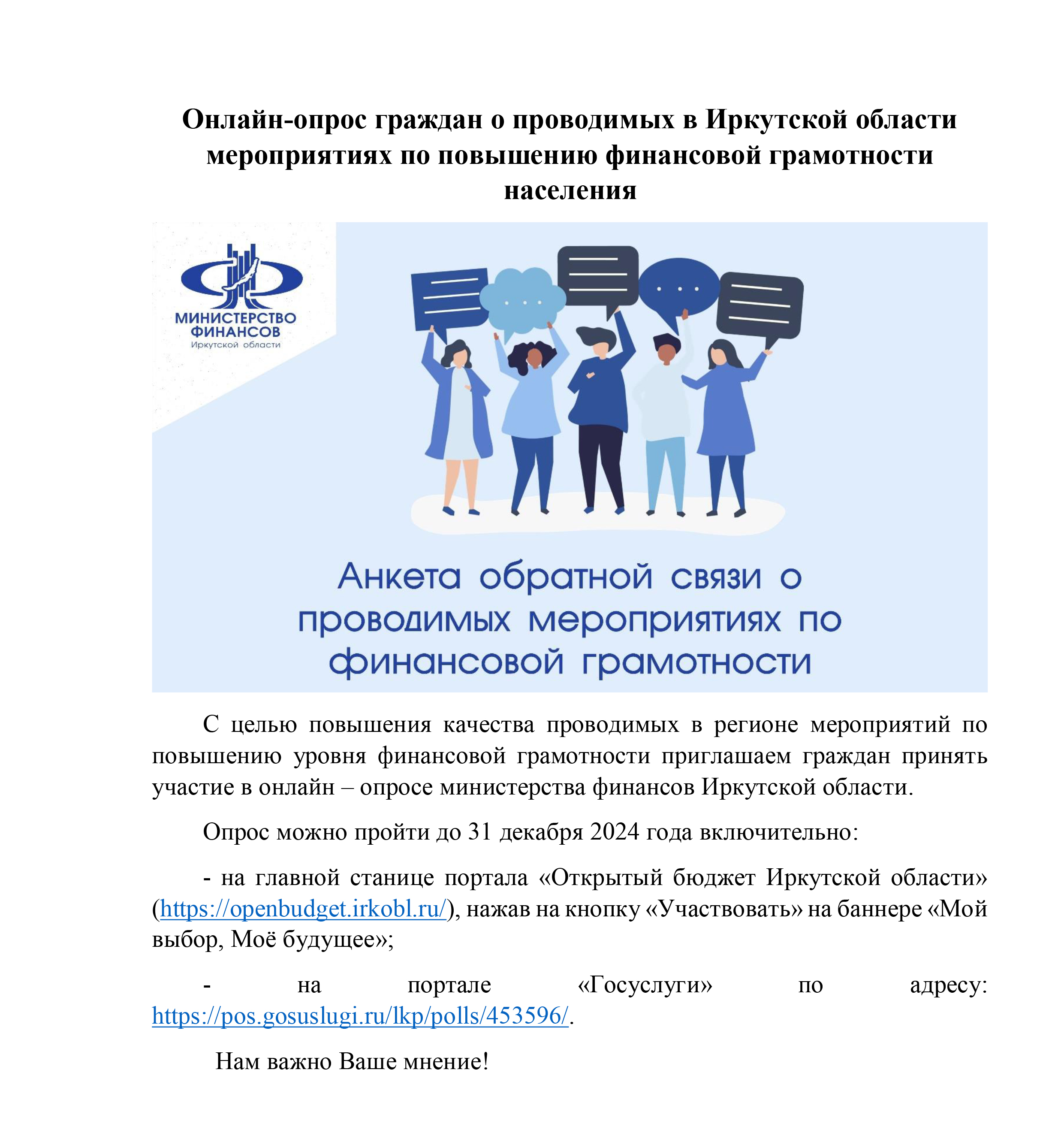 Главная / Новости / Онлайн-опрос граждан о проводимых в Иркутской области мероприятиях по повышению финансовой грамотности населения