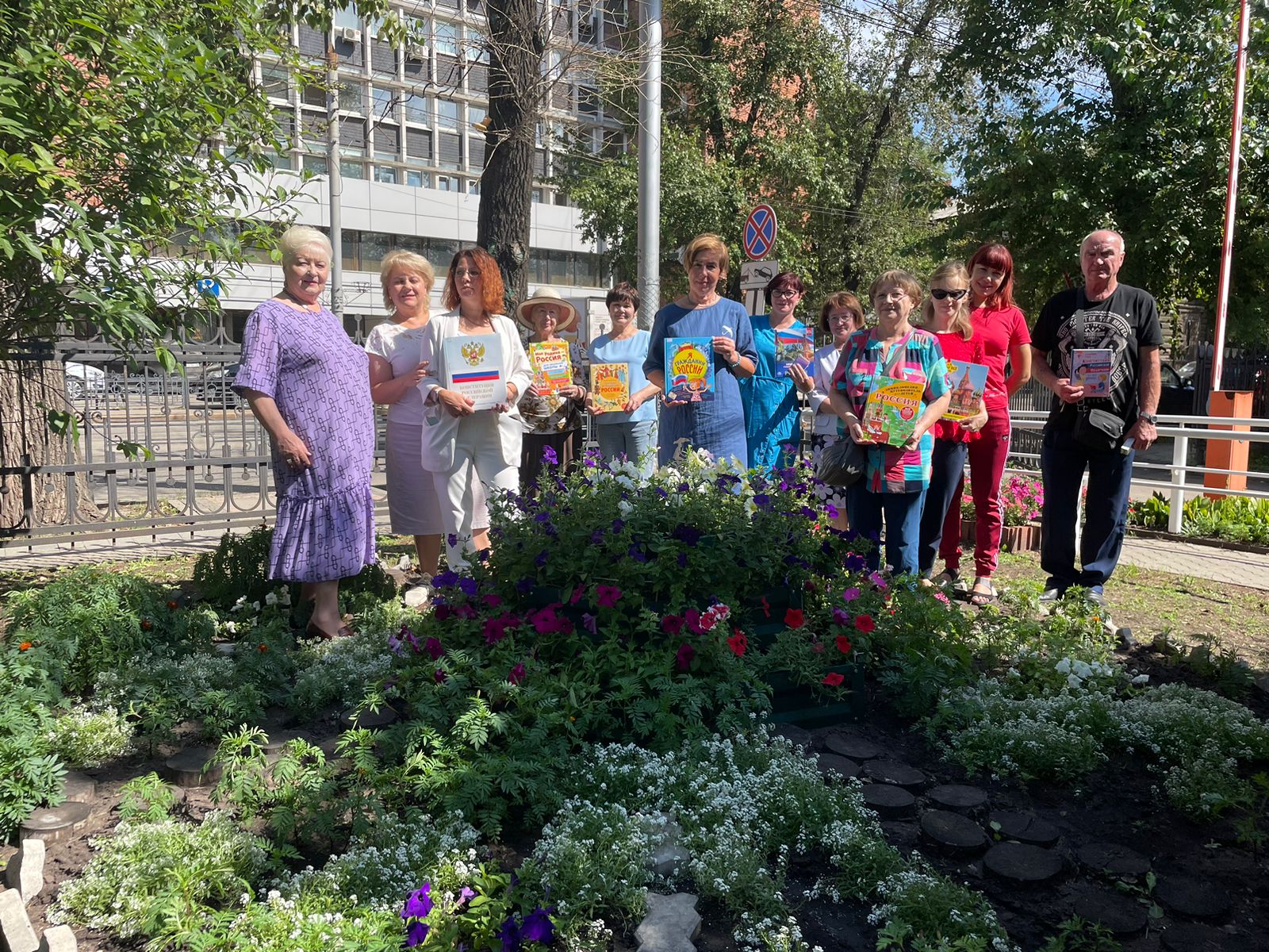 После окончания мероприятия читатели совместно с библиотекарями с удовольствием сфотографировались на фоне клумбы с дизайном флага Российской Федерации из цветов петунии белого, синего и красного цвета. Все читатели ушли домой с хорошим настроением и книгами, посвященными флагу Российской Федерации.